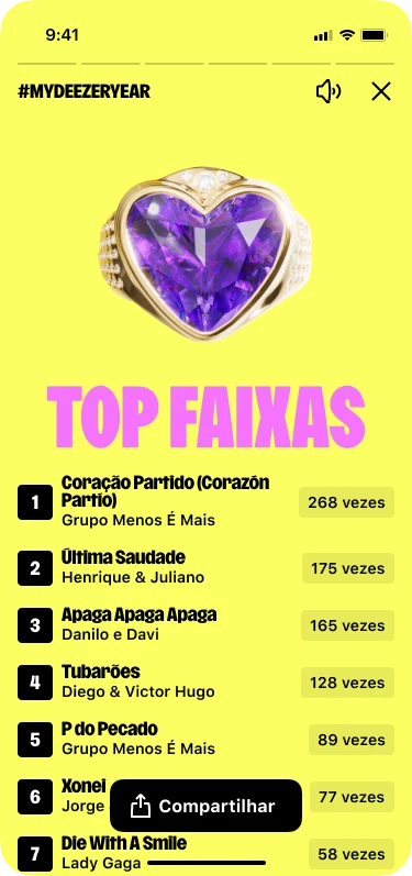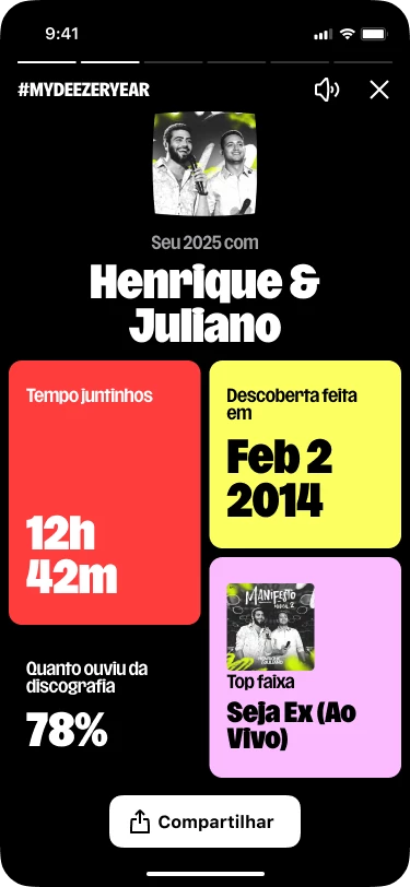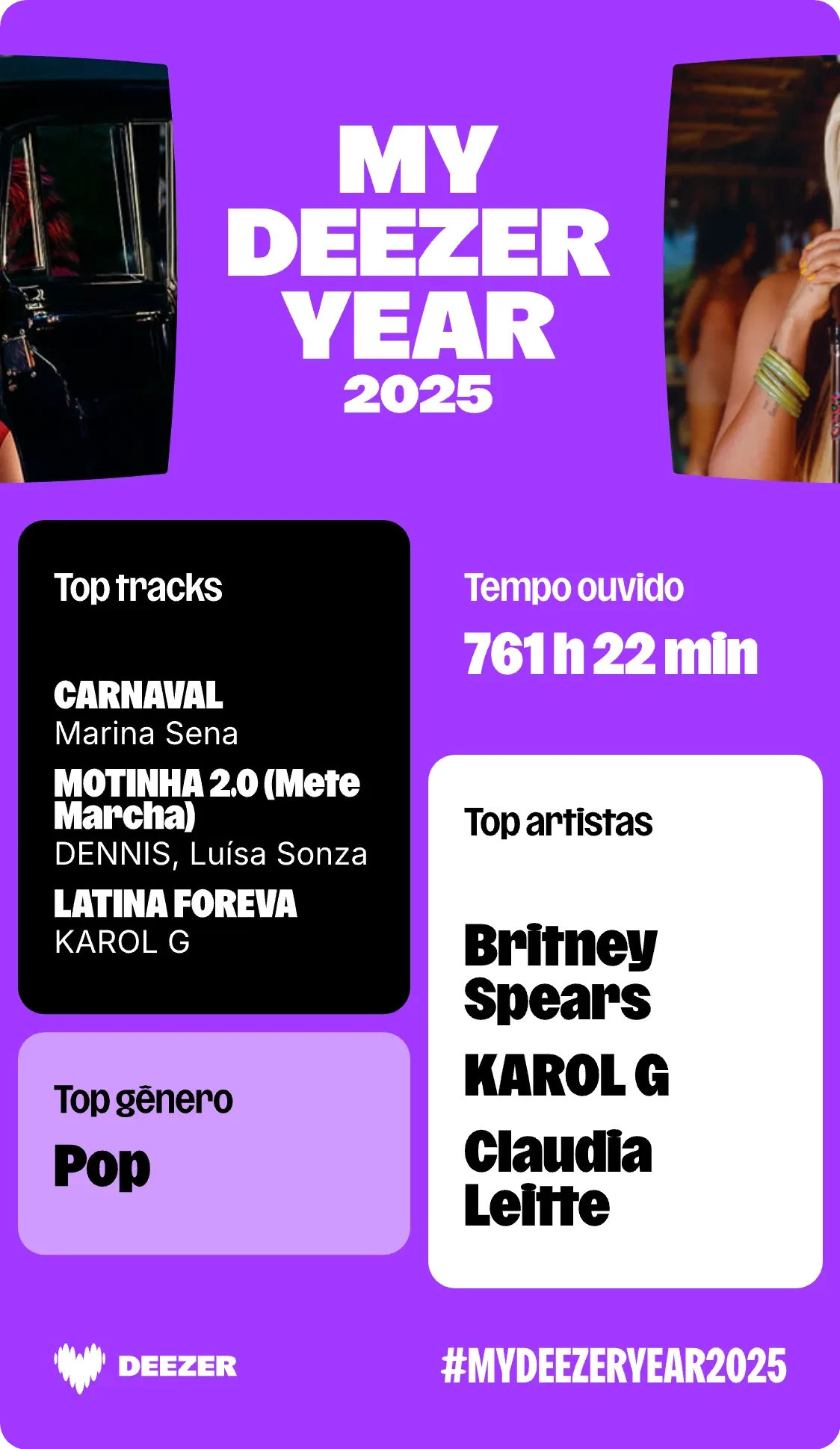 Quer a versão completa? No canal My Deezer Year você encontra: sua história + quiz, faixas mais ouvidas, gêneros favoritos, destaques editoriais, foco em mulheres, melhores covers, músicas mais tocadas e artistas para ficar de olho em 2026.