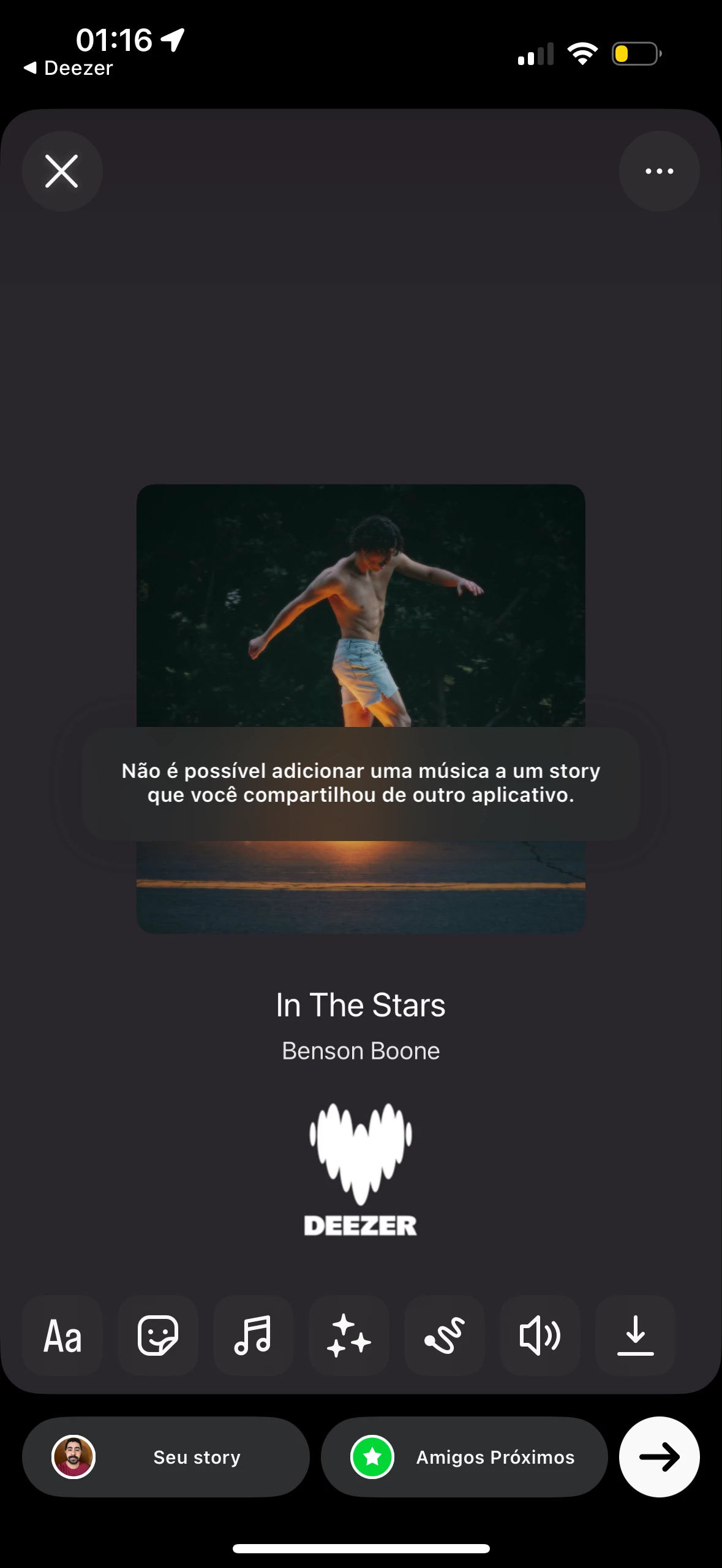 Quando a gente compartilha música do Spotify nos stories do Instagram, da pra colocar o áudio da música junto. Porque o Deezer não permite? É frustante compartilhar uma música nos stories e não conseguir aplicar o áudio