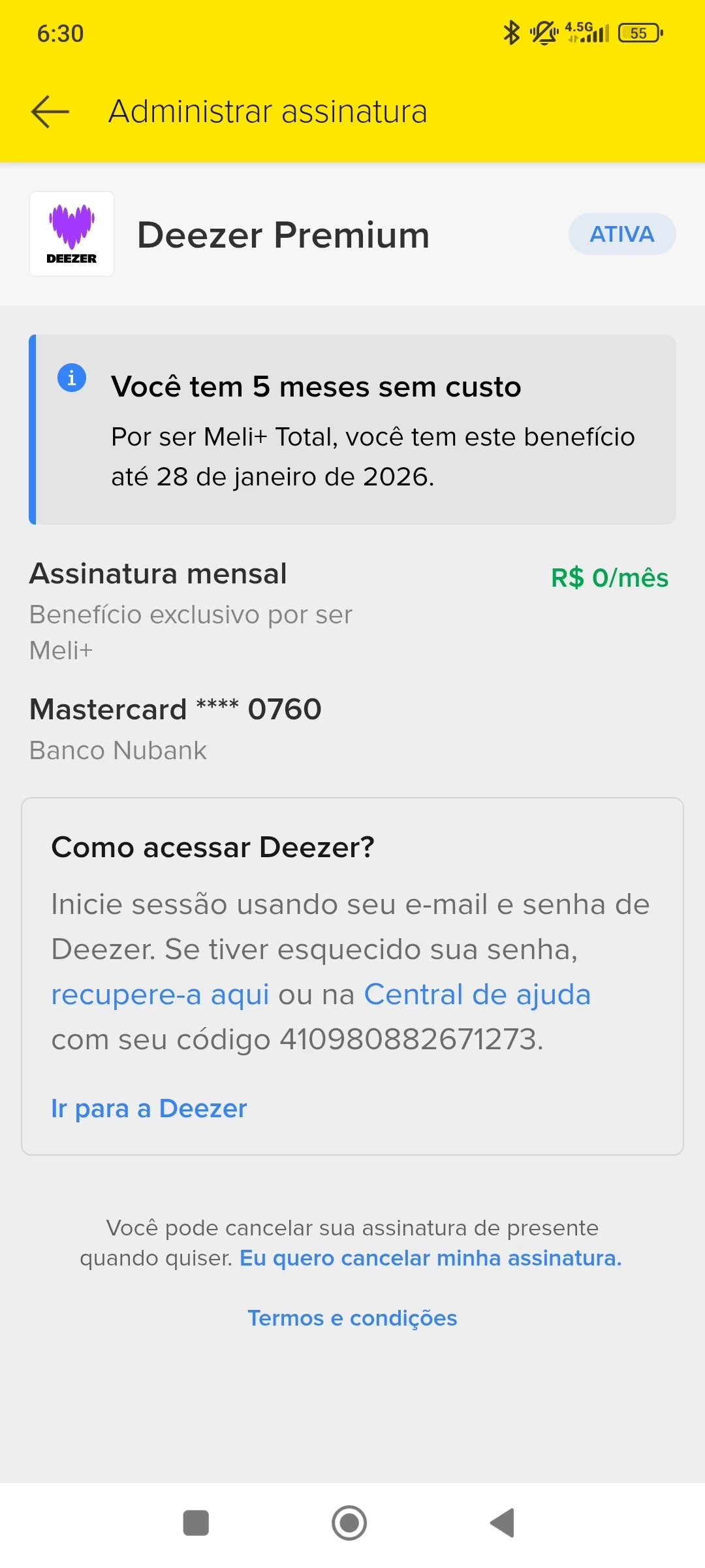 Oi @ademirdonisilva342 sugiro que entre em contato com suporte da Deezer e envie para eles uma captura de tela do app/site Mercado Pago onde mostra ativa sua assinatura Deezer e o seu Mercado Livre ID ( número composto por 13 algarismos, em que o primeiro dígito é um 4).