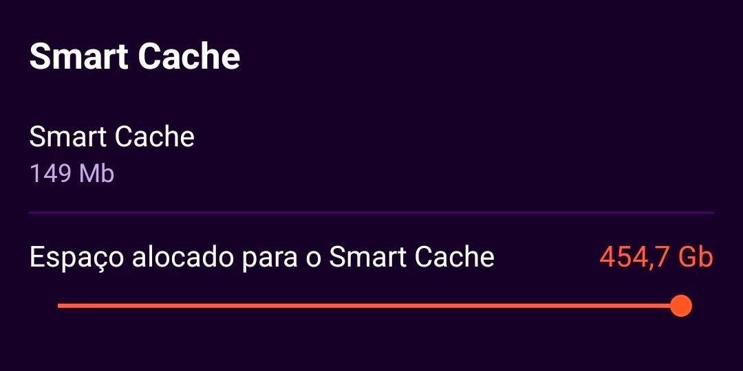Depois disso, reinicie o aplicativo, vai em dados e armazenamento e onde está escrito "espaço alocado para o smart cache", arraste a barrinha até o final, desta forma: