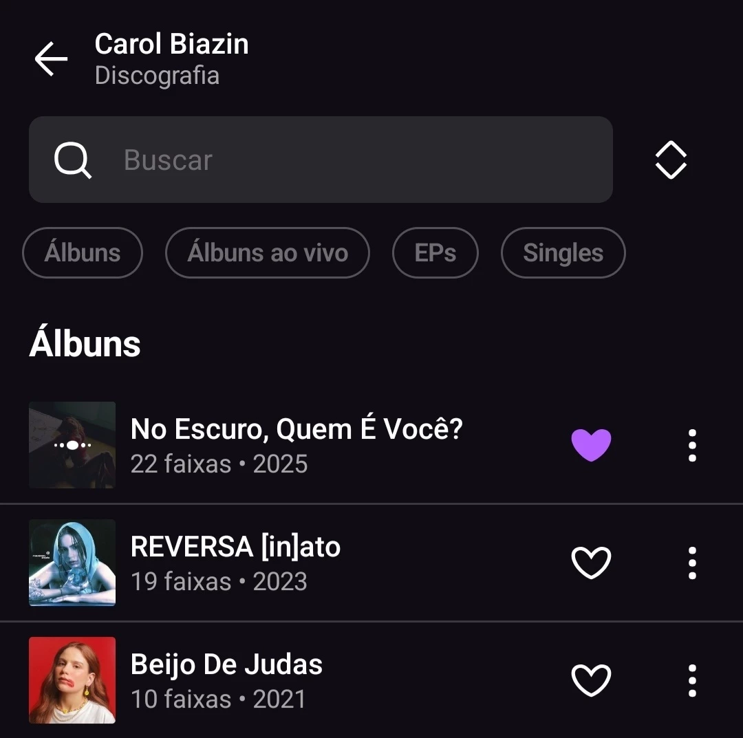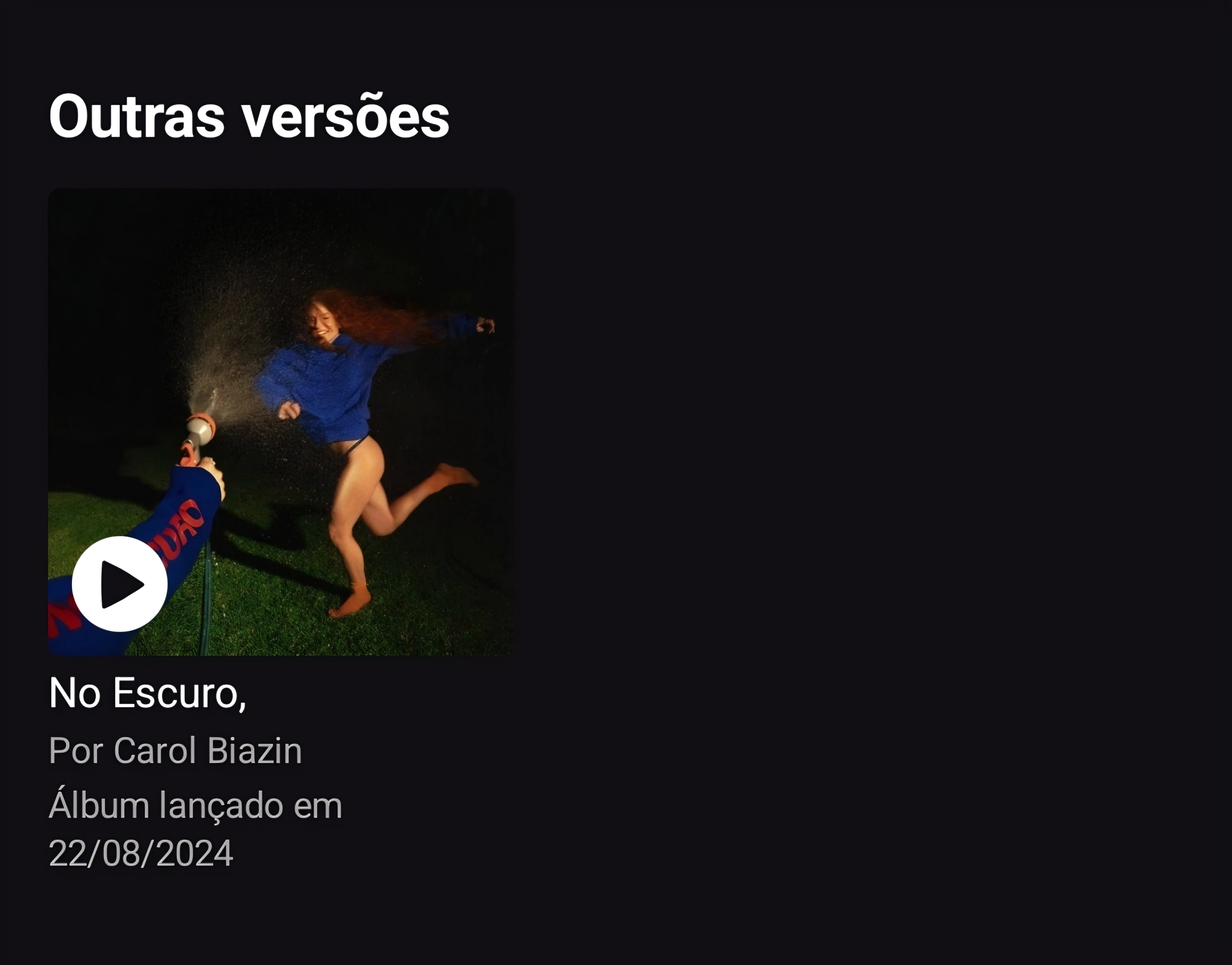 Por fim, isso também acontece no perfil da Carol Biazin, o álbum "No Escuro" de 2024 está escondido na aba de discografia da artista, pois o aplicativo identifica o album como uma "Outra versão" do recém lançado "No escuro, quem é você?"