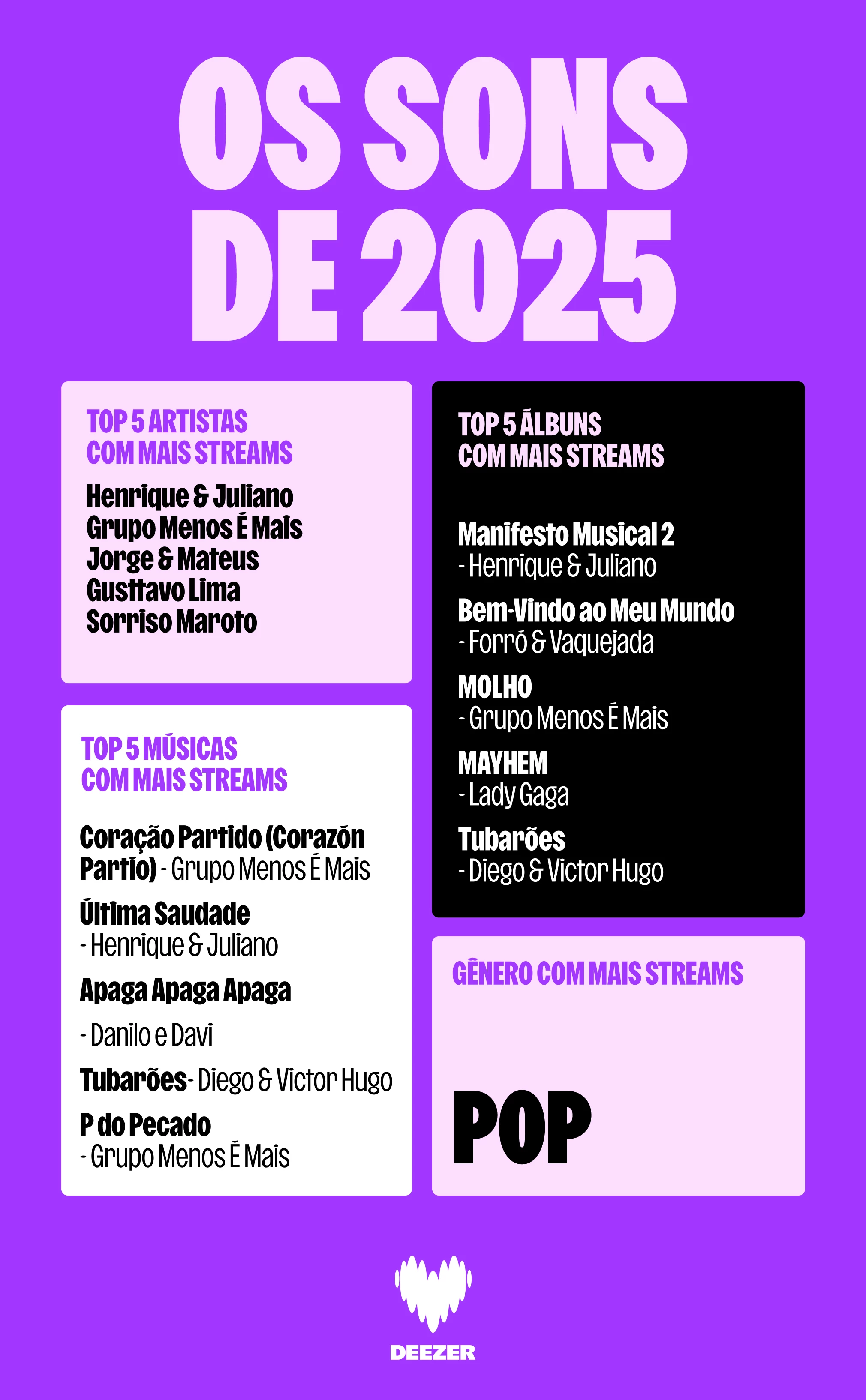 2025 no Brasil entregou uma trilha sonora digna de comédia romântica — cheia de altos, baixos e aqueles momentos de “cantando na cozinha”. Grupo Menos É Mais, Henrique & Juliano e Diego & Victor Hugo mantiveram o Pop no centro, misturando romance, nostalgia e a energia brasileira de sempre.